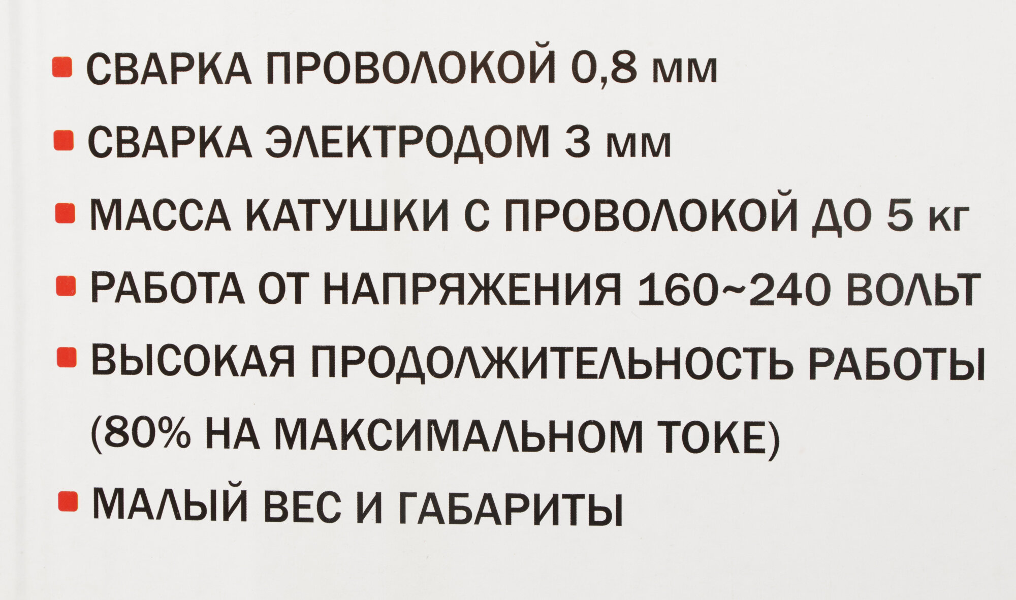 | Дополнительно | горячий старт (Hot Start) / форсаж дуги (Arc Force) / защита от залипания (Anti-Stick) / отключаемое cнижение напряжения х. х. (VRD) / цифровой дисплей |