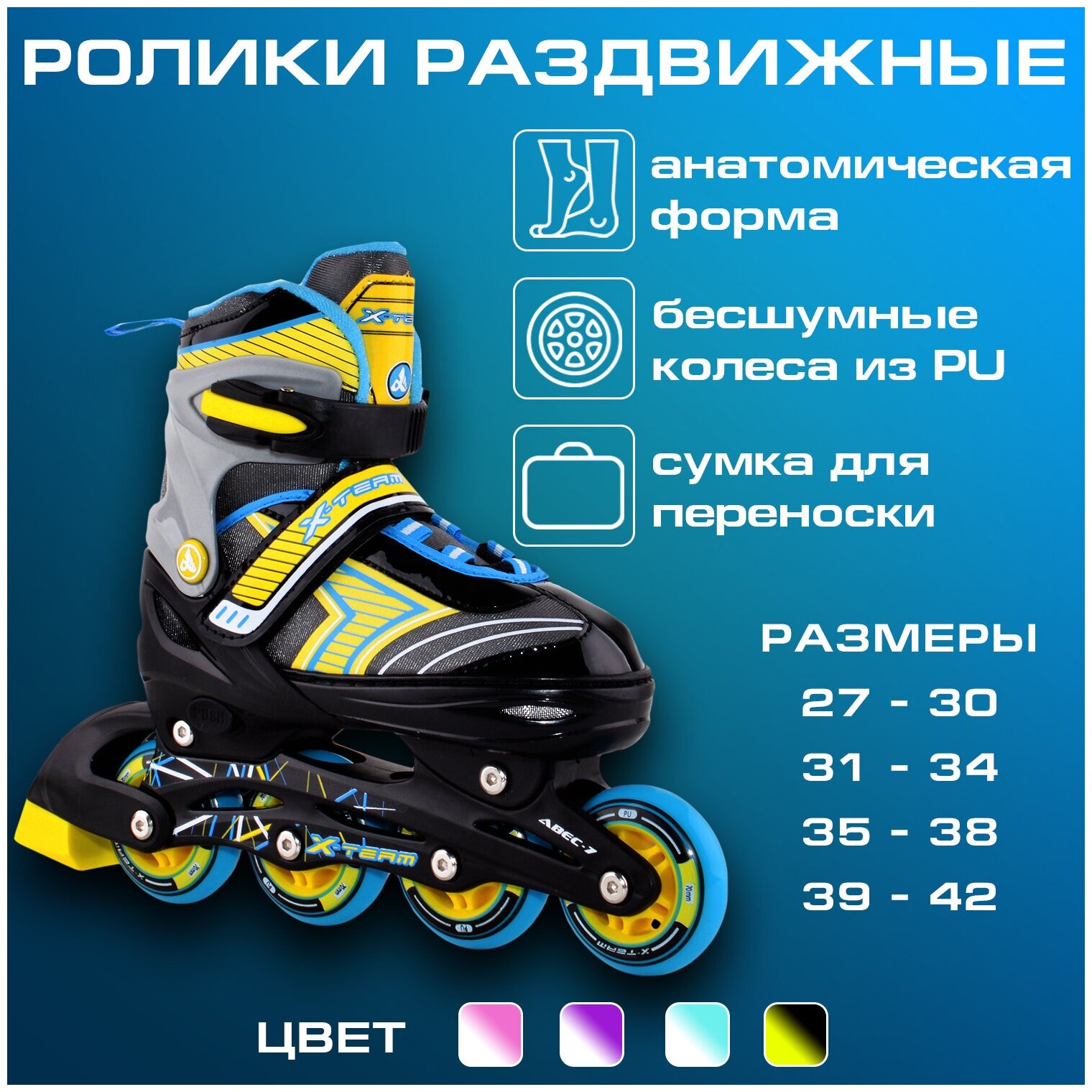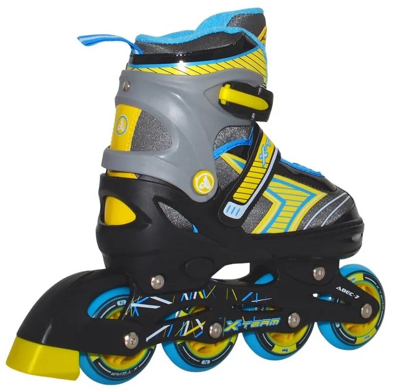 Лучшие цены. Роликовый раздвижной конек. Раздвигается на 4-е размера. Внешний ботинок: пластик, ткань. Внутренний ботинок: ткань, пенополиуретан. Тип фиксации: классическая система шнуровки, ремешок "velcro", клипса с фиксатором. Рама: пластик Материал колеса: PU (полиуретан). Размер колес: XS/S - 64*22 мм, M/L - 70*22 мм. Размер XS имеет 3 колеса, размер S/M/L имеет 4 колеса Подшипник: ABEC-7. Упаковка: удобная сумка с ручкой. Размер по стельке: XS - 15-17 см, S - 18-20 см, M - 21-23 см, L - 24-26 см. Магазины в вашем городе.