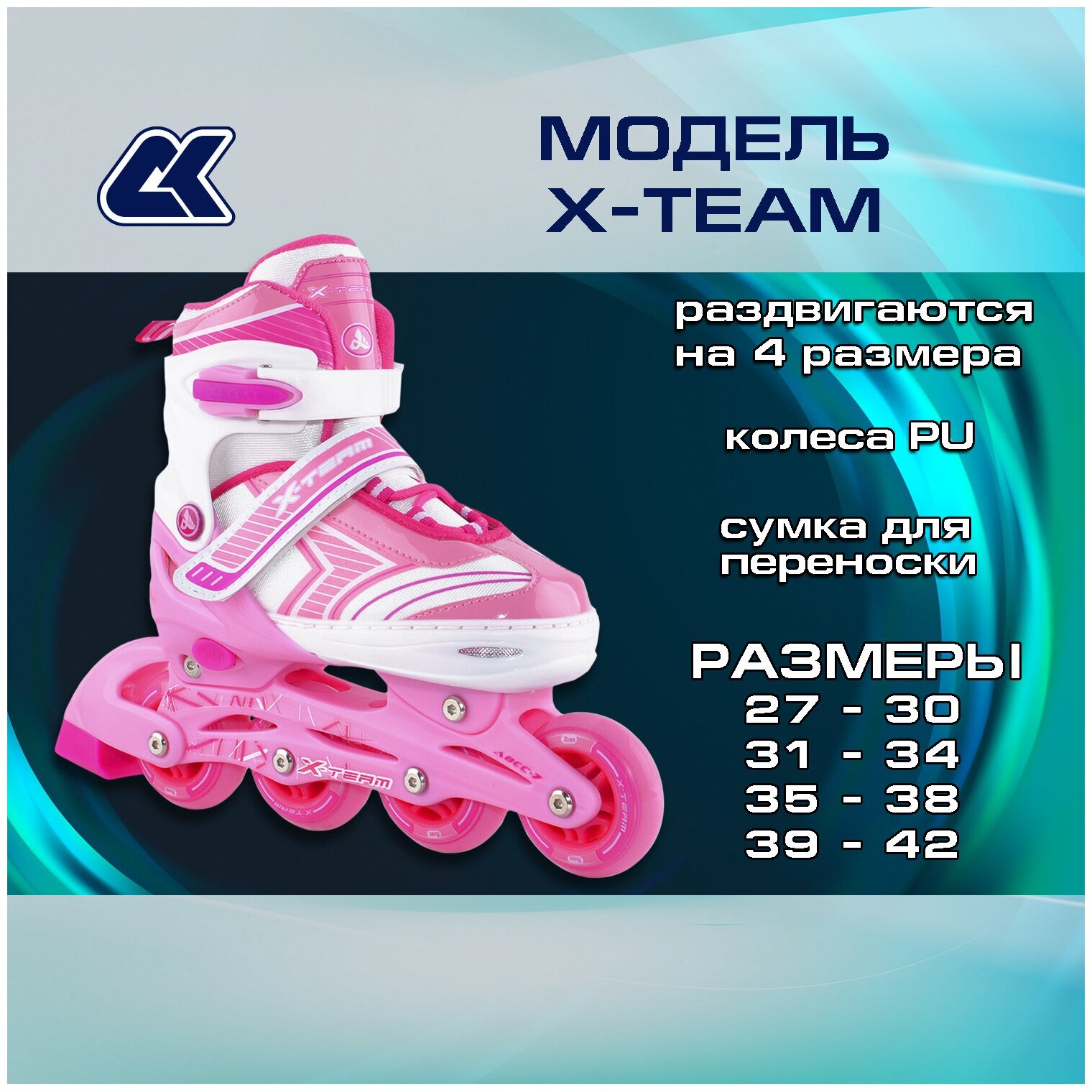 Лучшие цены. Роликовые раздвижные коньки. Ботинки раздвигаются на 4-е размера. Внешний ботинок: пластик, ткань. Внутренний ботинок: ткань, пенополиуретан. Тип фиксации: шнурки, ремешок velcro, клипса с фиксатором. Рама: пластик. Материал колеса: PU (полиуретан). Размер колеса: S, XS - 64х22 мм; M, L - 70х22 мм. Расположение колес: четыре в один ряд. Подшипник: ABEC-7. Тормоз на одном ботинке. Упаковка: удобная сумка-чехол с ручкой. Страна производитель: Китай. Детские ролики X-TEAM - практичный выбор для Вашего ребенка. Магазины в вашем городе.