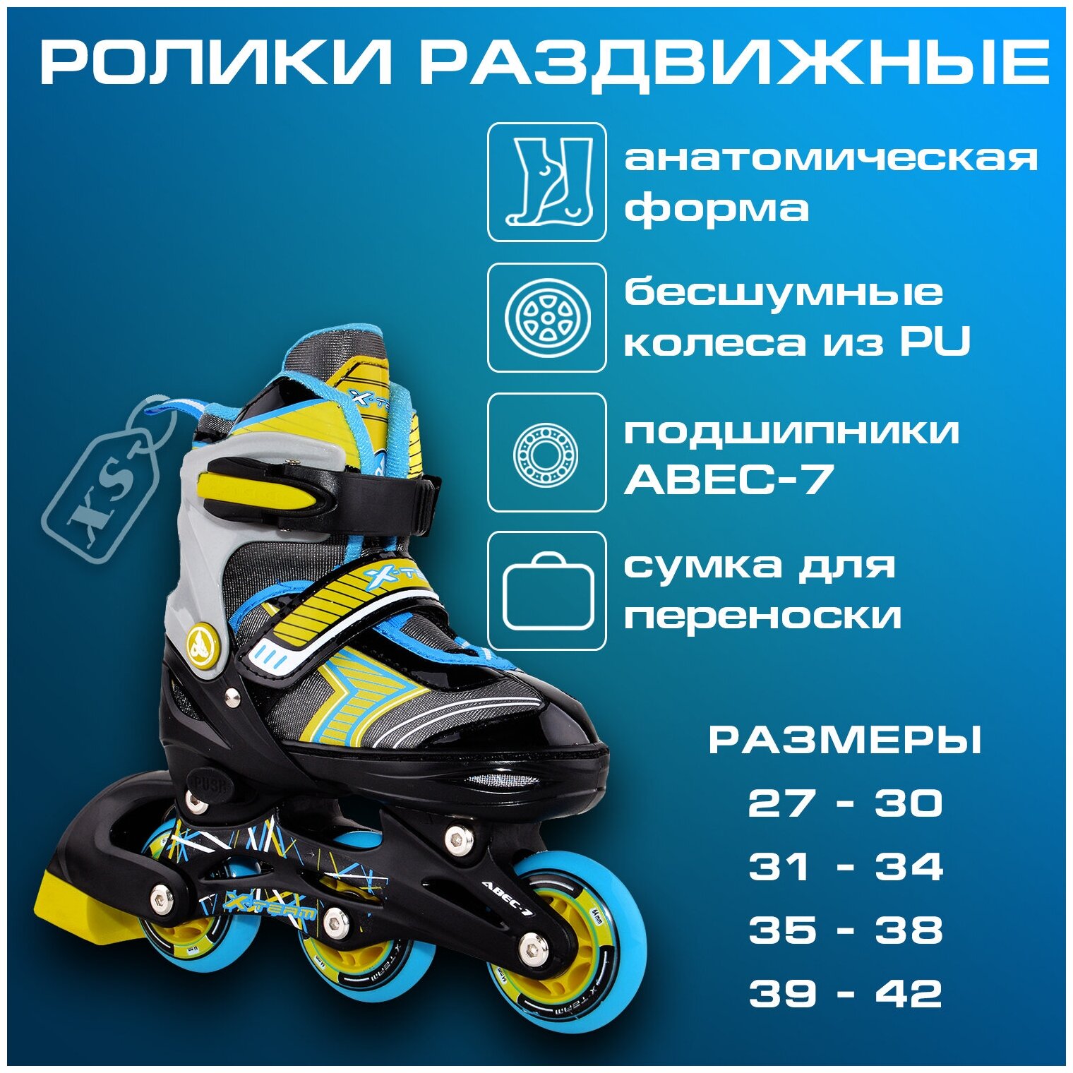 Лучшие цены. Роликовый раздвижной конек. Раздвигается на 4-е размера. Внешний ботинок: пластик, ткань. Внутренний ботинок: ткань, пенополиуретан. Тип фиксации: классическая система шнуровки, ремешок "velcro", клипса с фиксатором. Рама: пластик Материал колеса: PU (полиуретан). Размер колес: XS/S - 64*22 мм, M/L - 70*22 мм. Размер XS имеет 3 колеса, размер S/M/L имеет 4 колеса Подшипник: ABEC-7. Упаковка: удобная сумка с ручкой. Размер по стельке: XS - 15-17 см, S - 18-20 см, M - 21-23 см, L - 24-26 см. Магазины в вашем городе.
