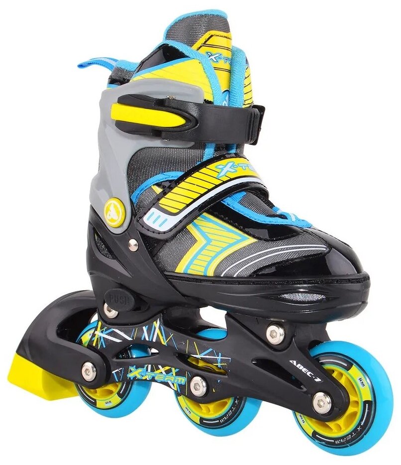 Лучшие цены. Роликовые раздвижные коньки. Ботинки раздвигаются на 4-е размера. Внешний ботинок: пластик, ткань. Внутренний ботинок: ткань, пенополиуретан. Тип фиксации: шнурки, ремешок velcro, клипса с фиксатором. Рама: пластик. Материал колеса: PU (полиуретан). Размер колеса: S, XS - 64х22 мм; M, L - 70х22 мм. Расположение колес: четыре в один ряд. Подшипник: ABEC-7. Тормоз на одном ботинке. Упаковка: удобная сумка-чехол с ручкой. Страна производитель: Китай. Детские ролики X-TEAM - практичный выбор для Вашего ребенка. Магазины в вашем городе.