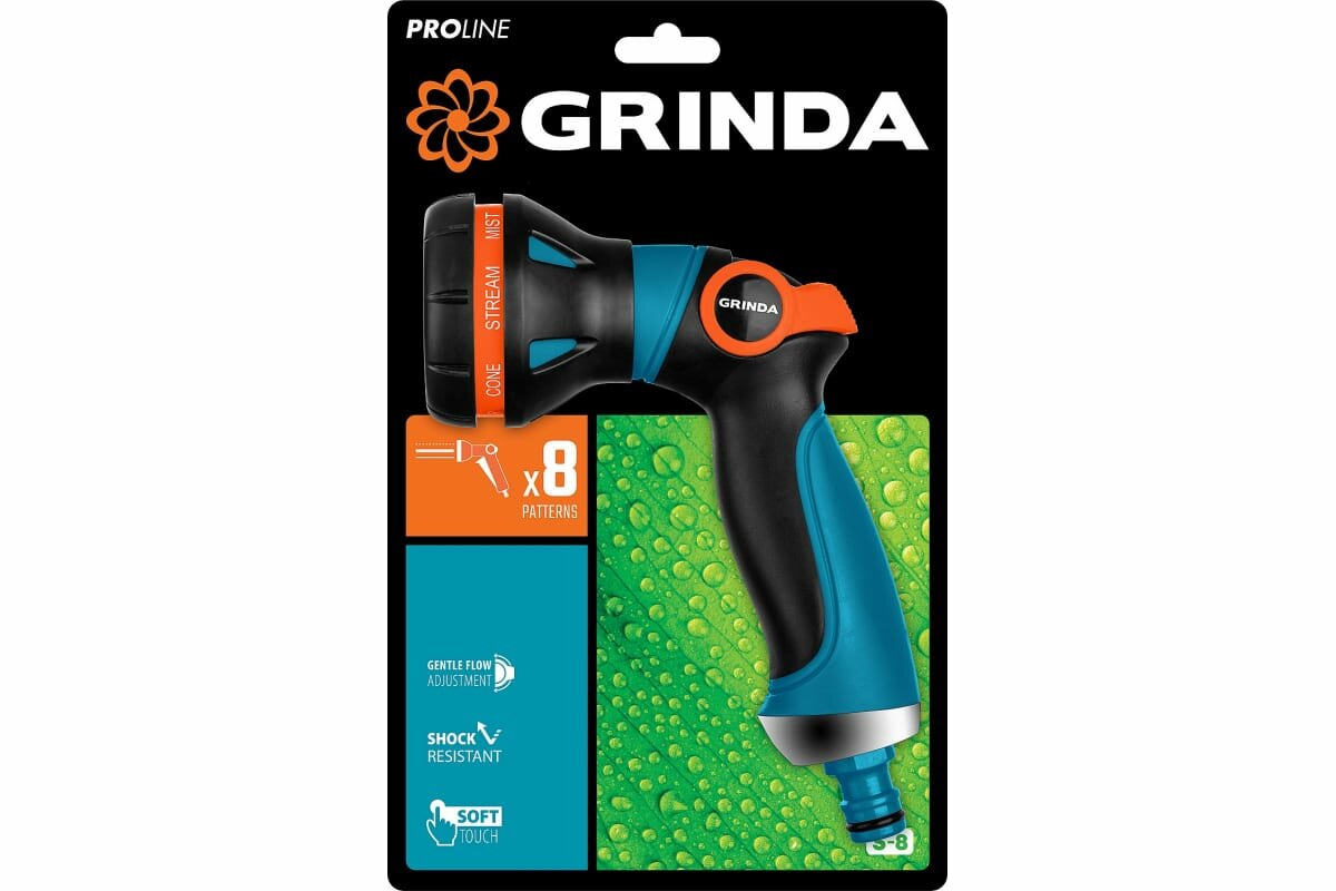 GRINDA PROLine S-8, 8 режимов, пистолет поливочный двухкомпонентный с регулятором напора (429100)