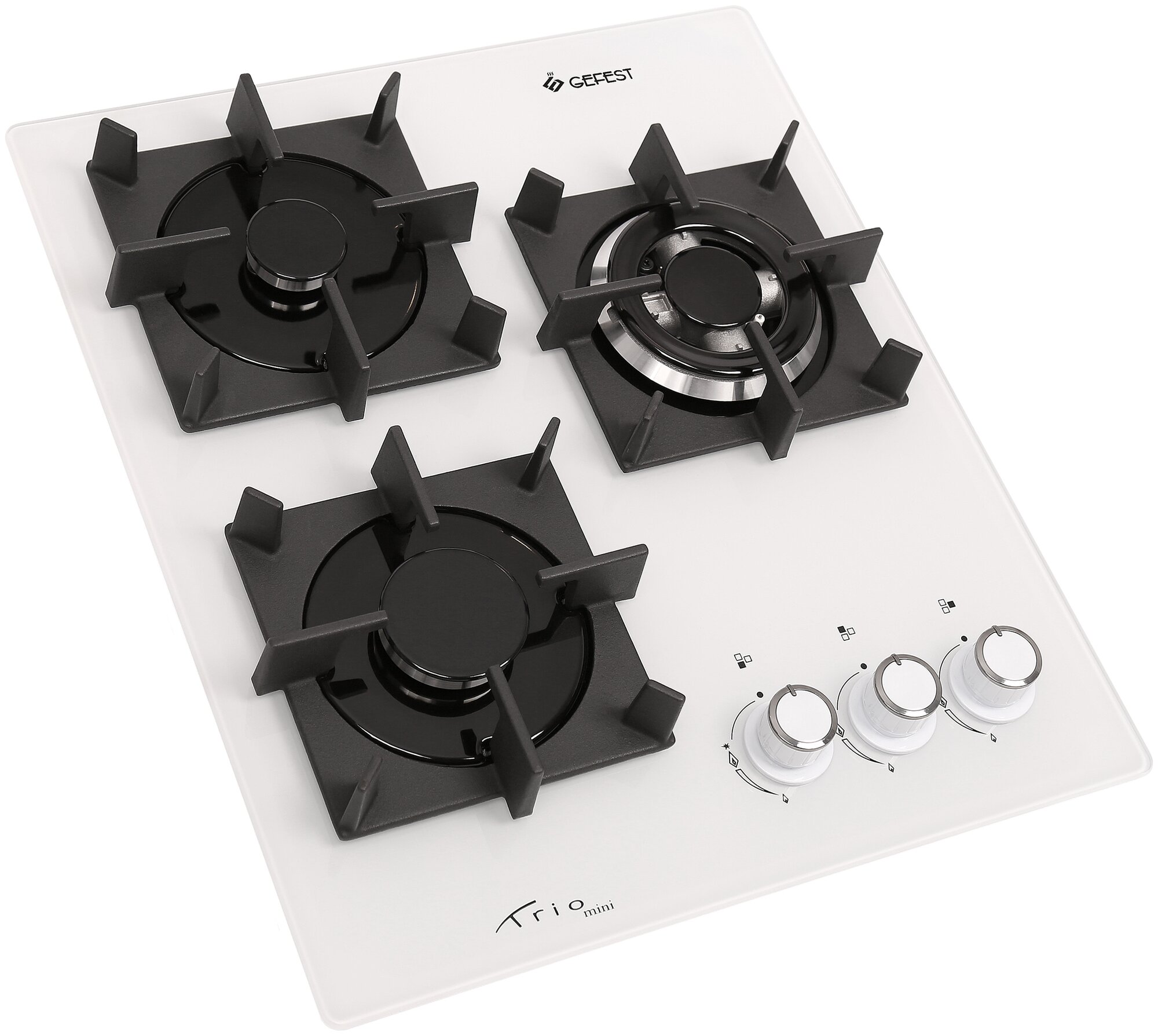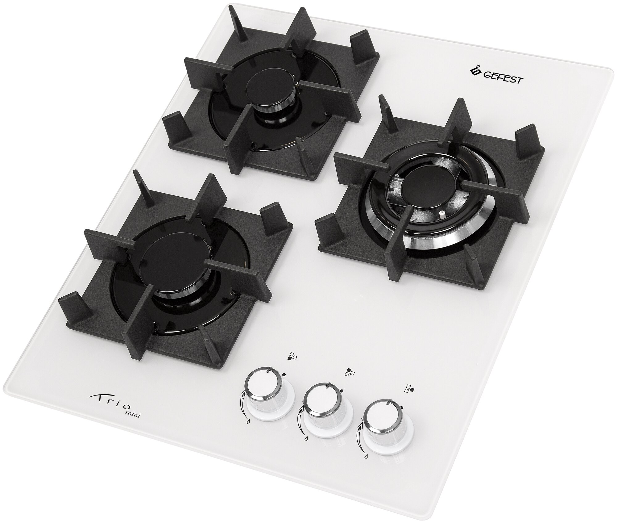 Лучшие цены. Газовая варочная поверхность Gefest ПВГ 2100-01 К32 имеет ширину 45см. Рабочая поверхность из закаленного стекла белого цвета, одна из конфорок двойная корона повышенной мощности. Чугунные решетки установлены отдельно на каждую конфорку, благодаря им посуда защищена от скольжения и переворачивания. В ручки управления пламенем встроен автоматический электроподжиг, конфорка зажигается не от спички, а от сгенерированной искры. Магазины в вашем городе.