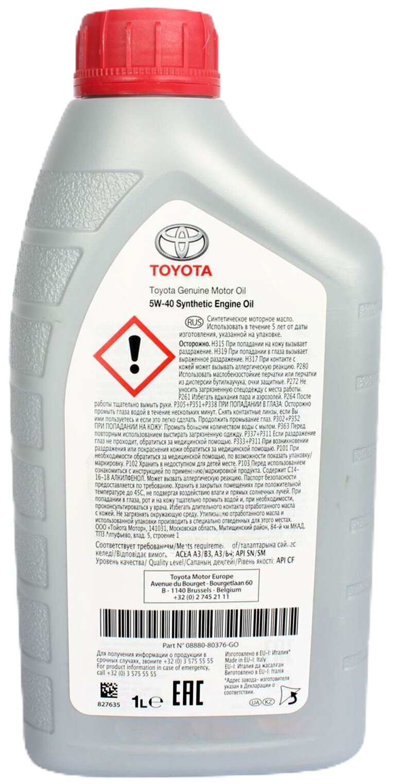 Toyota motor oil 5w40 sn/sm acea a3/b3, a3/b4 (европа) / моторное масло синтетическое 1 л 08880-80376