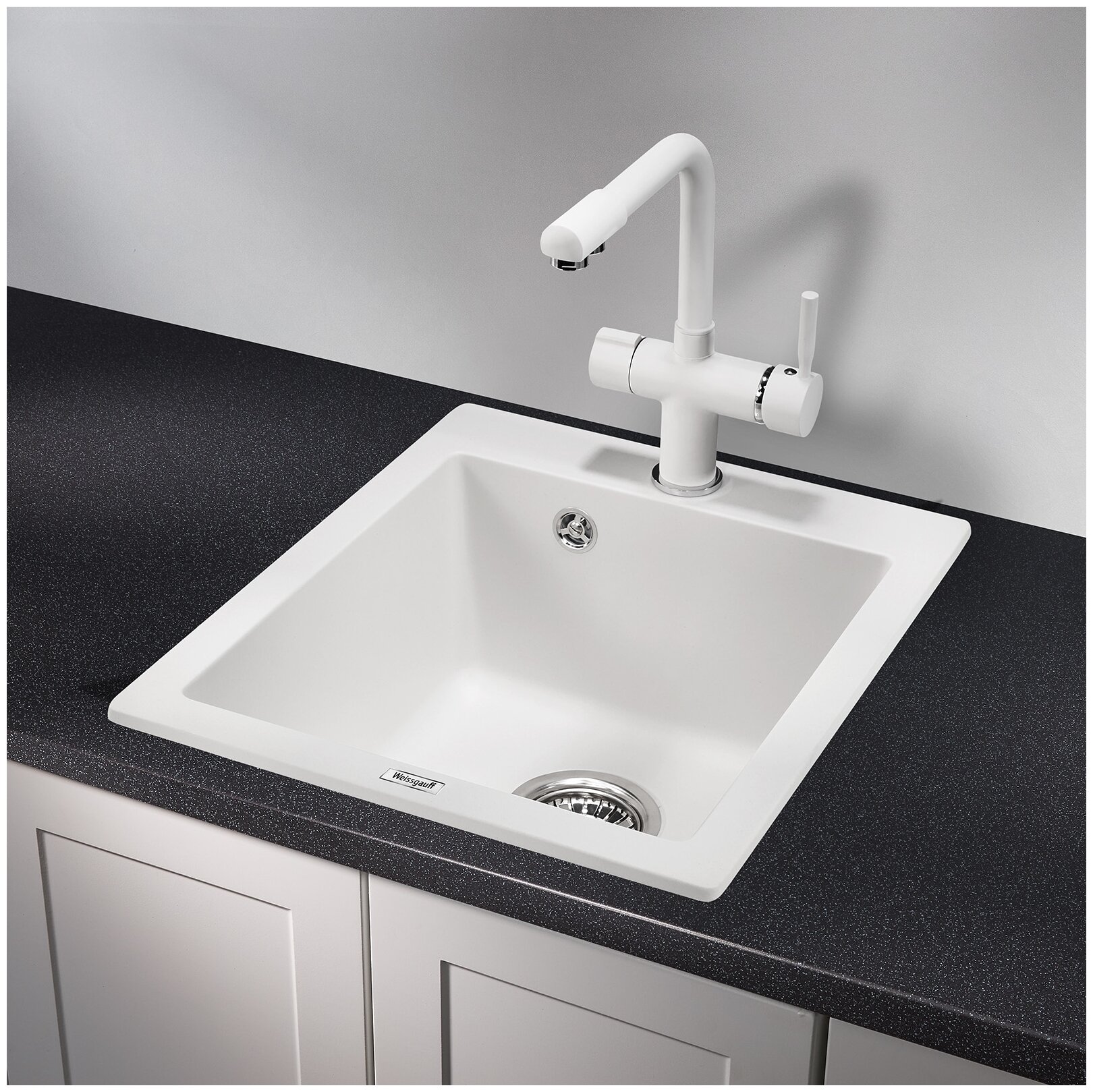 Лучшие цены. Кухонная мойка Weissgauff с чашей прямоугольной формы, выполненная из высококачественного искусственного камня и предназначенная для накладной установки в кухонный шкаф шириной 40 см - это настоящее сочетание лаконичного внешнего вида и безупречной надежности. Магазины в вашем городе.