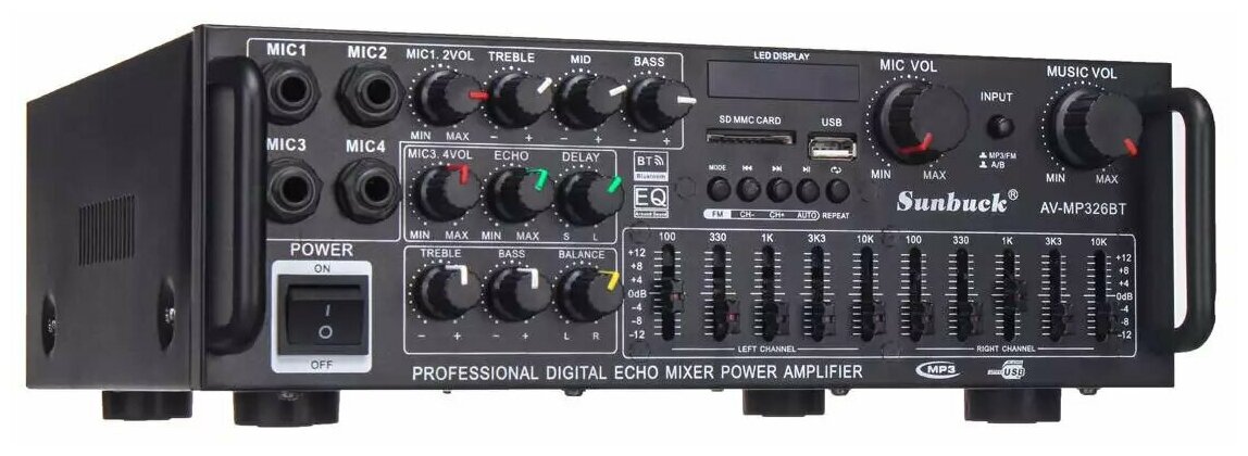Лучшие цены. Sunbuck AV-MP326BT – усилитель со встроенным аудиоплеером, FM-радио, Bluetooth, эквалайзером, поддержкой USB флешек и карт памяти SD а так же четырьмя входами для микрофонов. Максимальная мощность 2х400Вт (номинальная 2х200Вт), что позволяет использовать его как дома, так и для проведения различных мероприятий. В усилителе предусмотрены клеммы для подключения автомобильного аккумулятора 12В. Магазины в вашем городе.