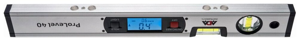 Лучшие цены. Цифровой уровень ADA ProLevel 40 для измерения углов наклона деталей и плоскостей. Удобно читаемый цифровой электронный дисплей отображает отклонение от горизонтали/вертикали, получая данные с встроенного датчика уклона (инклинометра). Для точной работы есть автоматическая калибровка. Данные отображаются в градусах, мм/м, %, in/ft. Для удобства работы есть режим HOLD - удержания результатов на дисплее и подсветка. Магазины в вашем городе.