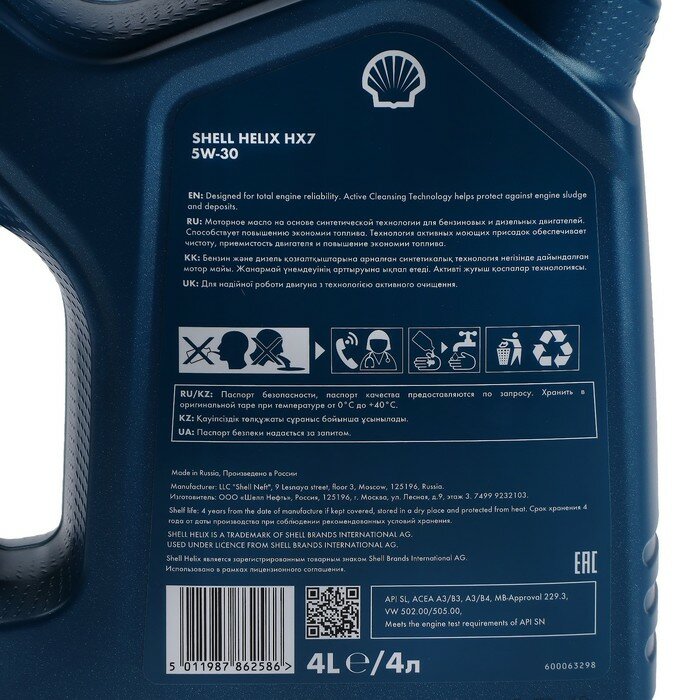 Масло 5w30 Shell Helix Hx7 П/Синт. 550046351 (4,0л.) (Sl/Sn; A3/B3/B4) (550040304) Api: Sl/Sn // Acea: A3/B3/B4 // Mb-Approva...