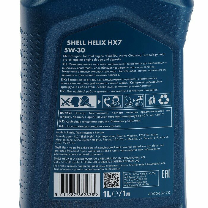 SHELL 550040304 5W30 4L HELIX HX7 масло моторное полусинтетическое 6 834 ₽ Подробнее