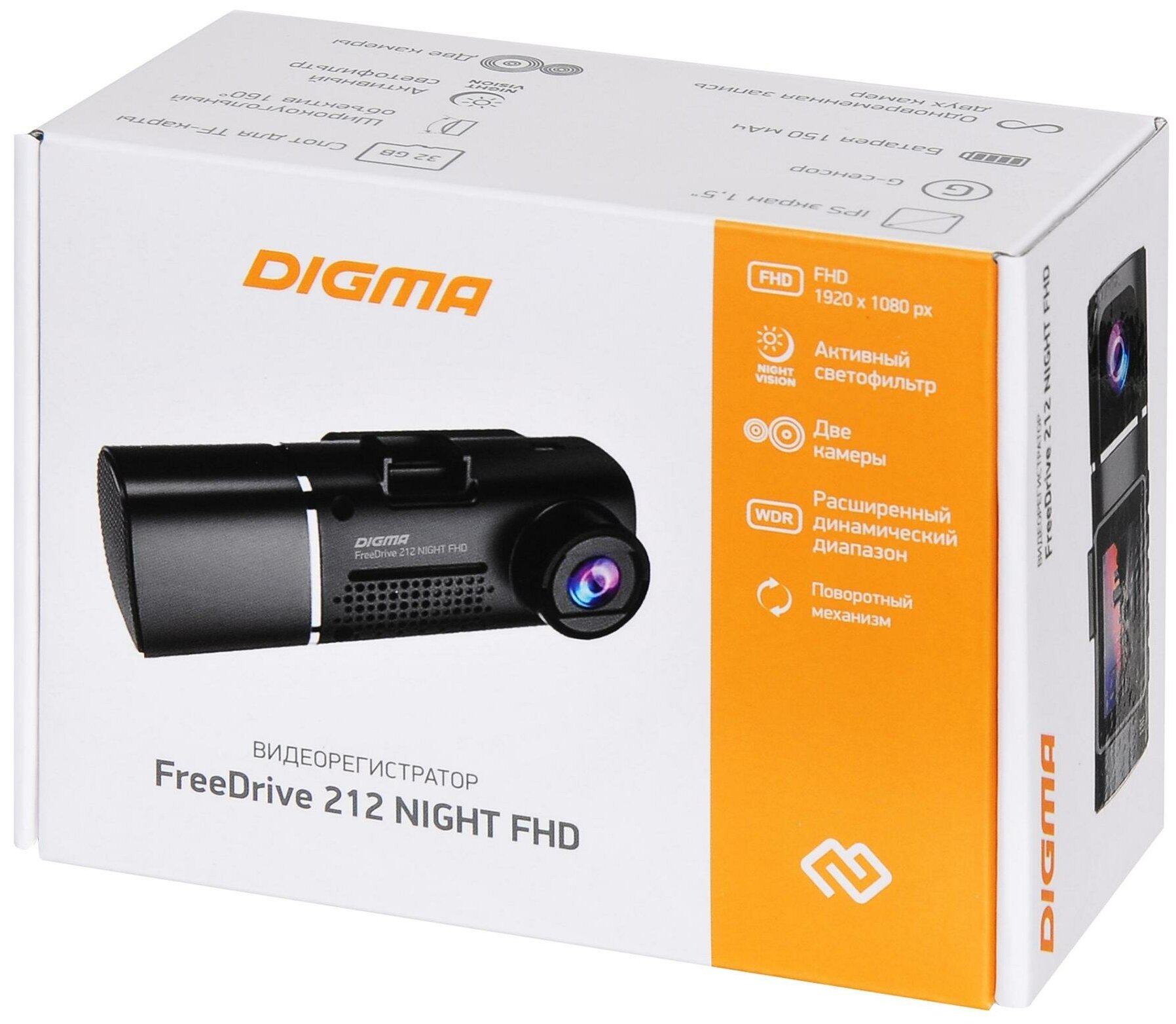 Лучшие цены. Видеорегистратор Digma FreeDrive 212 Night FD с двумя камерами – верный друг и помощник водителя. Он крепится на лобовое стекло автомобиля и фиксирует всё, что попадает в объективы. полезная информация Угол обзора основного модуля составляет 160°, он ведёт запись с максимальным разрешением 1920 х 1080 пикселей и дополнен функцией ночной съёмки. При воспроизведении сделанного с его помощью ролика вы легко рассмотрите всё, что может иметь значение, в том числе номера машин, расположение дорожных знаков и лица. Магазины в вашем городе.