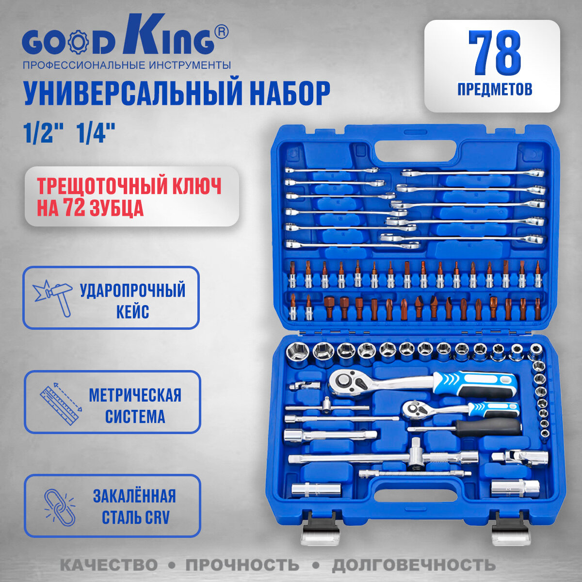 Наборы инструментов Набор инструментов 78 предметов 1/4" 1/2" трещотка 72 зуба GOODKING B-10078 Набор инструментов для авто, для дома