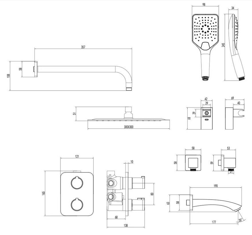 | Комплектация | ручной душ (душевая лейка) / верхний душ (тропический) / смеситель / излив / душевой шланг / крепление ручного душа / настенный кронштейн |