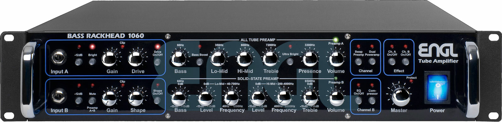 Лучшие цены. ENGL E1060 BASS RACKHEAD - Басовый усилитель/Ламповый+транзисторный преамп/Усилитель D 2х350 Вт/1х1700 Басовый усилитель/Ламповый+транзисторный преамп, 2x350/1x1700 Вт Свойства: -2 канала (ламповый и транзисторные преампы) -2 x 350 Ватт или 1x 1700 Ватт (2 усилителя класса D) -Универсальный импульсный блок питания -Мьютирование каналов Каналы: Ламповый(A): -4 лампы 12AX7 - -12cB ослабление -переключатель яркости -регулировка Гейн -индикатор перегруза -регулятор драйв, выключатель -5-полосная регулировка. Магазины в вашем городе.