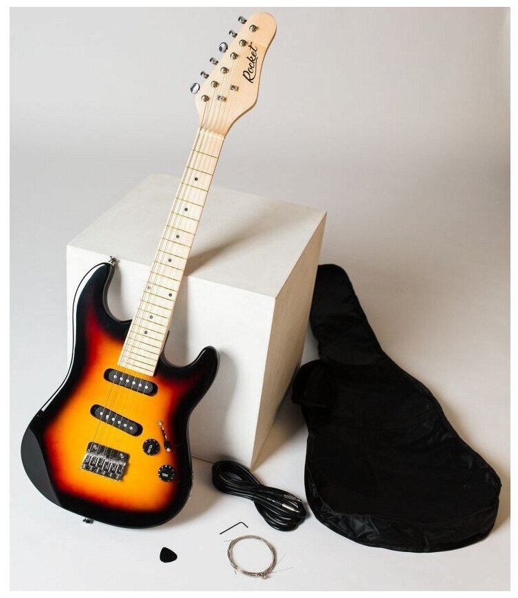 Лучшие цены. Электрогитара детская ROCKET ST-32 SB тип корпуса Stratocaster, корпус липа, гриф клён, 22 лада, звукосниматели 2 сингла, регулировки - 1 громкость, 2 тона, 5-ти позиционный переключатель звукоснимателей, цвет - санбёрст. Магазины в вашем городе.
