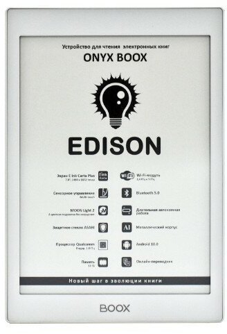 Лучшие цены. Наиболее продвинутые современные электронные книги по характеристикам и дизайну напоминают планшеты. По сути, они планшетами и являются – но планшетами специфическими, заточенными в первую очередь под чтение книг, комиксов и документов. Модель ONYX BOOX Edison относится именно к этой категории: да, она снабжается мощным 8-ядерным процессором от Qualcomm и 3 Гб оперативки и работает под управлением Android 10, но экран у неё чёрно-белый и довольно медленный, что накладывает ограничения на использование. Магазины в вашем городе.