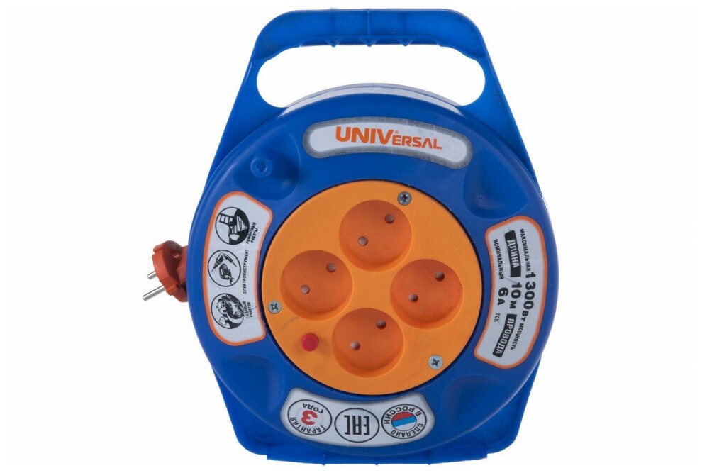 Лучшие цены. Характеристики Количество розеток, шт: 4 Длина кабеля, м: 10 Напряжение сети, В: 220 Тип провода: ПВС Заземление: нет Степень защиты: IP20 Max нагрузка (Вт): 1300 Номинальная сила тока, А: 6 Крепление на стену: да Материал катушки: пластик Область применения: Тяжелые условия Сечение провода, мм²: 2х0.75 Наличие термовыключателя: да Морозостойкий: нет Материал вилки: резина Материал розетки/гнезда: пластик Цвет провода: оранжевый Вес нетто, кг: 1. Магазины в вашем городе.