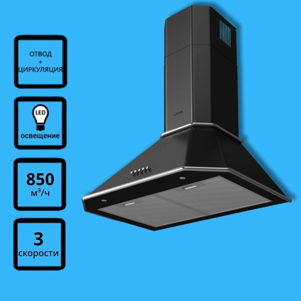 Настенная вытяжка Korting/ Кухонная вытяжка, Настенная вытяжка, Ширина 60 см, Мощность: 850 м3/ч, 3 режима, Механическое кнопочное управление, Алюминиевые жировые фильтры, 2 LED лампы освещения, цвет - матовый черный, профиль рамок и кнопки - хром