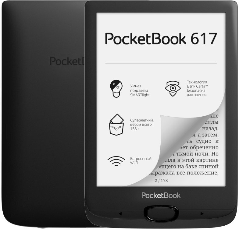 Лучшие цены. PocketBook 617 – уникальная бюджетная модель. Да, она управляется кнопками и лишена сенсорного экрана. Зато в ней есть ряд опций, пришедших из ридеров топ-класса. Это подсветка с регулировкой цветовой температуры. Это поддержка Wi-Fi и букшерингового сервиса PocketBook Cloud. Это мощный двухъядерный процессор. Словом, PocketBook 617 – решение для экономных любителей классики, которые, тем не менее, желают получить исключительно современное устройство. Магазины в вашем городе.