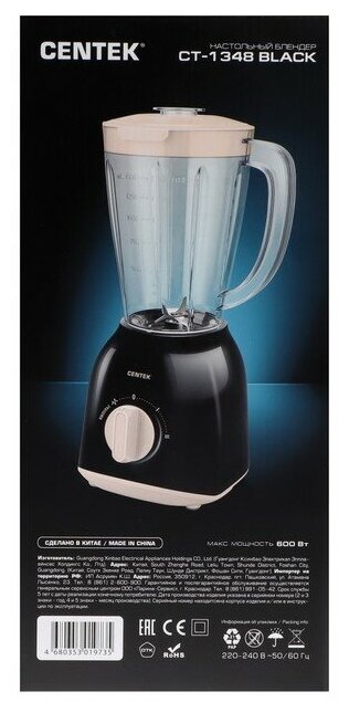 Блендер Centek Ct-1348, стационарный, 600 Вт, 1.5 л, 2 скорости, импульсивный режим, чёрный Centek 9