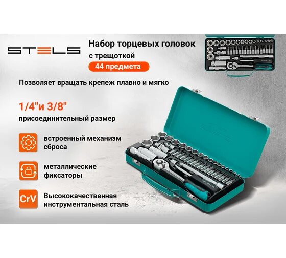 Набор торцевых головок с трещоткой, 1/4 и 3/8, 44 предмета Stels, ( 13575 )