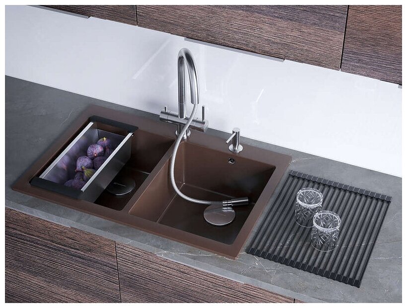 Лучшие цены. Мойка Omoikiri BOSEN 80-2 отливается из искусственного гранита TetoGranit. Модель предусматривает в себе две объемных чаши, что обеспечивает комфорт эксплуатации. Например, в одной можно замачивать посуду, а в другой споласкивать тарелки или продукты. На удобном уступе можно разместить смеситель, дозатор и другие полезные аксессуары. Материал поверхности устойчив к перепадам температур, образованию сколов и царапин, что гарантирует долговечность использования раковины. Магазины в вашем городе.