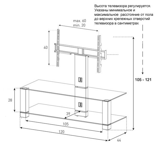 Лучшие цены. Надежная cтойка под ТВ с жестким креплением станет элегантным и незаменимым элементом любого интерьера. Изготовлена из закаленного стекла и высококачественного алюминия. Поворотное крепление подходит для всех видов плоских телевизоров (LCD, LED и плазма). Есть кабель-канал для скрытия проводов и скрытые колесики для перемещения стойки. Стойка предназначена для телевизоров с диагональю 32-65 дюймов. Крепление поддерживает форматы 20x20, 30x30, 40x40. Магазины в вашем городе.