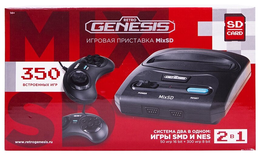 Лучшие цены. Retro Genesis MixSD + 2 джойстика + 350 игр + microSD слот (AV кабель, 2 проводных джойстика) Игровая приставка Retro Genesis MixSD с поддержкой сразу двух платформ – 8 и 16 бит – позволяет играть в игры типа Famicom/NES/Dendy и Sega. А с помощью слота для карт памяти microSD можно запускать собственные 16-битные игры. Встроенные 350 игр, из которых 300 игр 8 бит и 50 игр 16 бит, предлагают широкий спектр развлечений, в числе которых увлекательные игры про Марио, Танчики и Соника. Магазины в вашем городе.