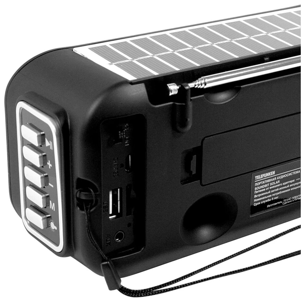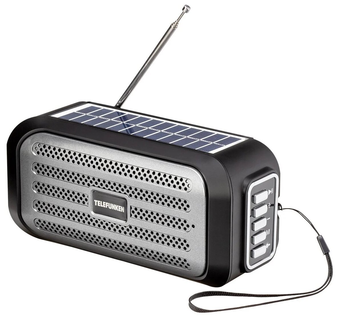 Лучшие цены. Бренд Telefunken представляет новую модель портативной акустической системы TF-PS1244B, которая не займет много места и заменит собой несколько дополнительных аксессуаров, таких как радио или карманный фонарик. Модель автономна, и способна работать до 7 часов на одном заряде. Еще одной отличительной особенностью устройства является наличие встроенной солнечной батареи, с помощью которой можно зарядить колонку самым экологичным способом. Магазины в вашем городе.