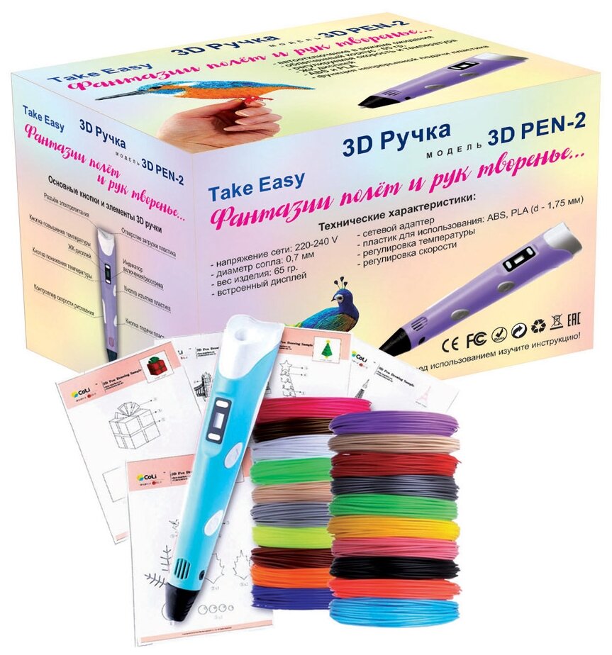 3D ручка Take Easy 3D PEN, 20 рулонов пластика по 10 м, 20 трафаретов фиолетовый