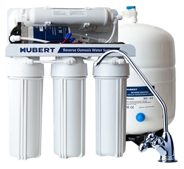 Лучшие цены. Hubert RO50B-DR система обратного осмоса с пятью ступенями очистки и насосом для повышения давления. Удаляет из воды до 99% примесей: механические взвеси, растворенные соли кальция и магния, тяжелые металлы, бактерии и вирусы. Магазины в вашем городе.