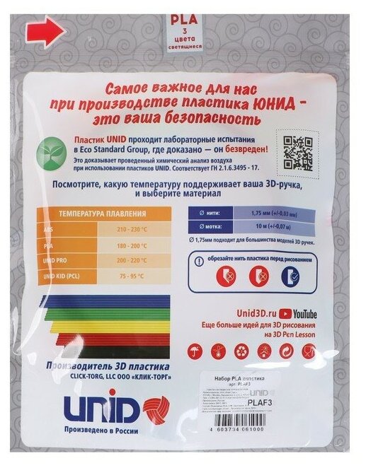3D-ручка Пластик UNID PLA-"F3", для 3D ручки, по 10 м, 3 цвета в наборе, светящийся