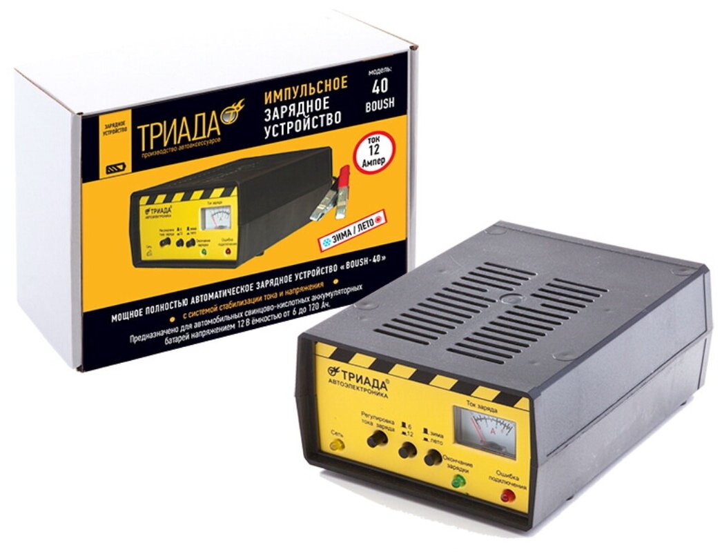 Профессиональное мощное импульсное зарядное устройство "Триада-40 6/12 А" (в коробке). 2 режима работы: 6/12 А Опция зима/лето. Стрелочный индикатор, плавная регулировка тока. Индикация окончания заряда, переполюсовки. Вес нетто 720 г.
