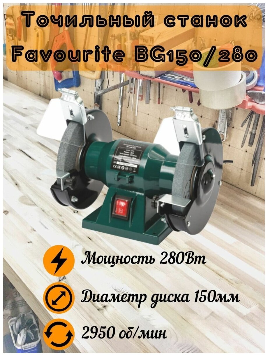 Лучшие цены. Точильный станок FAVOURITE 280Вт, ф150мм, 2950об/мин BG 150/280 применяется для обслуживания строительных, промышленных и бытовых инструментов. Имеет компактные габариты для удобной транспортировки и хранения. Шлифовальные круги оборудованы защитными экранами, что предотвращает попадание искр на оператора в процессе работы. Устойчивое снование точильного станка препятствует его переворачиванию в процессе эксплуатации. Магазины в вашем городе.