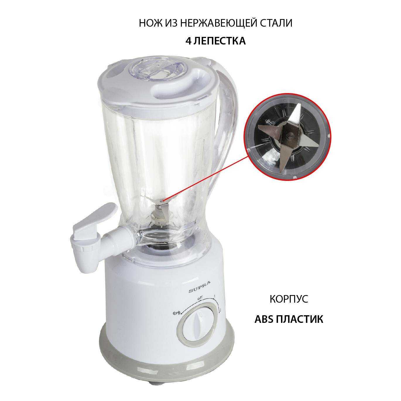 Лучшие цены. Стационарный блендер SUPRA HBS-9967 станет универсальным помощником на вашей кухне и украсит собой любое пространство. В блендере предусмотрено 2 скорости работы, а также кратковременный особо сильный импульсный режим, который используется для перемалывания особо твердых продуктов. Для вашего удобства в кувшин встроен кран-дозатор, не нужно снимать кувшин с корпуса, чтобы налить напиток. Магазины в вашем городе.