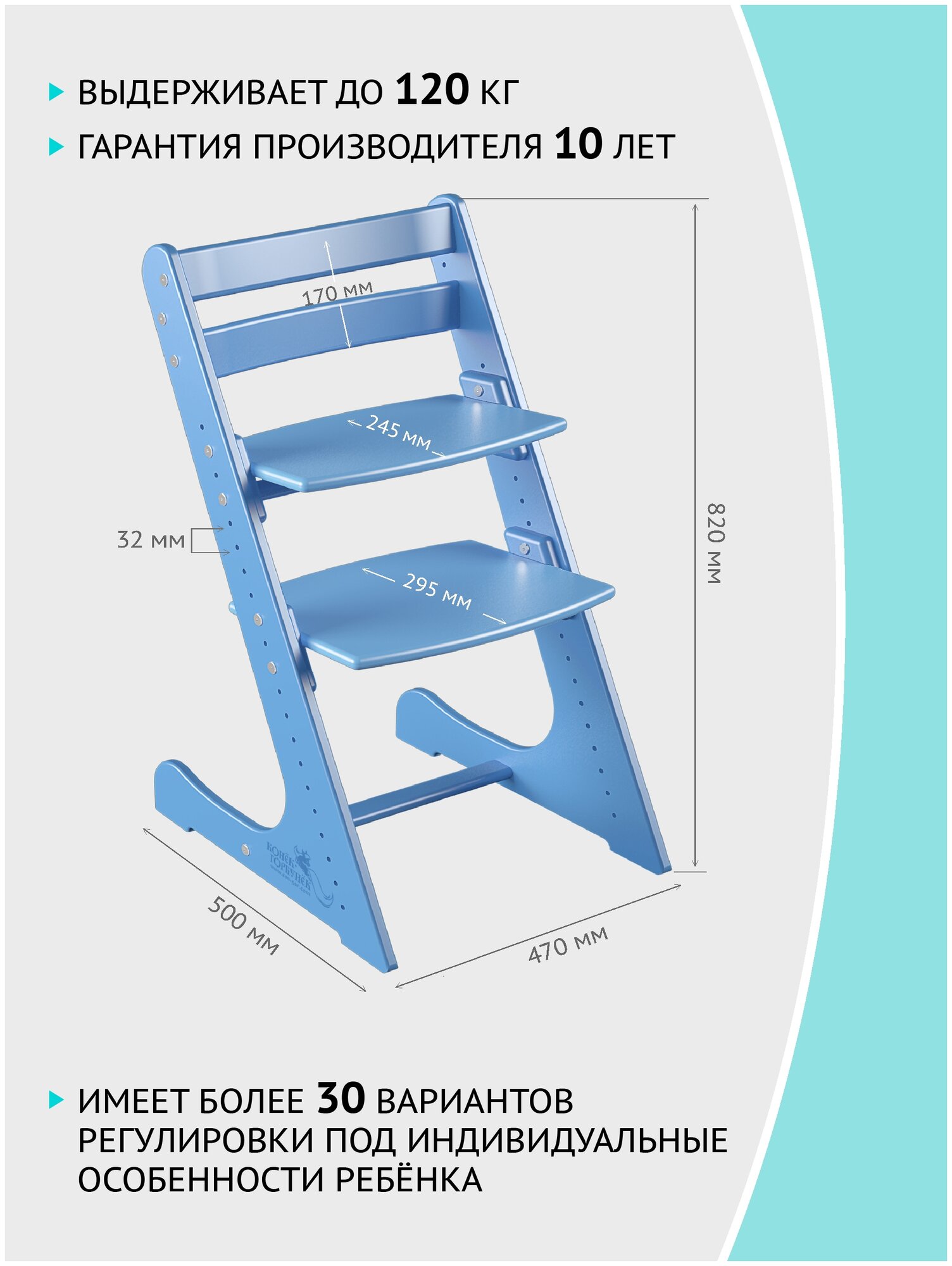 Растущий стул для детей, детский деревянный стульчик для школьника Конек Горбунек Комфорт, цвет Лазурный