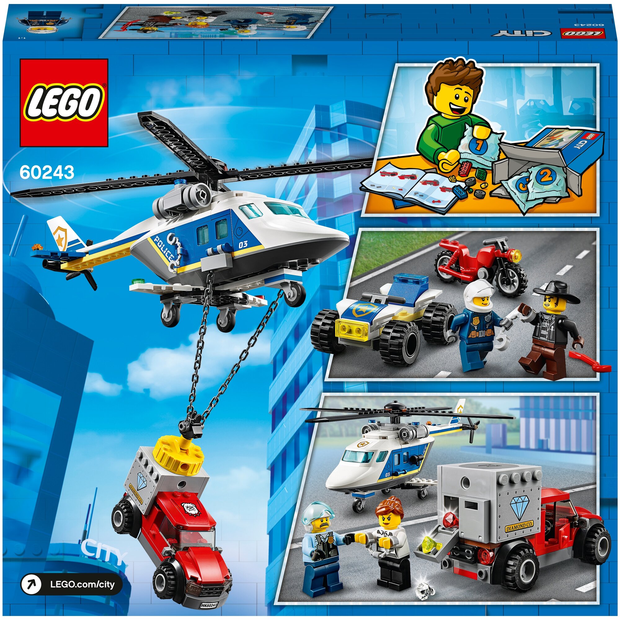 Лучшие цены. Конструктор LEGO City Police 60243 "Погоня на полицейском вертолете" увлечет надолго любого ребенка. Присоединяйтесь к патрулю и отправляйтесь за преступником. За ними отправляется полицейский вертолет. Он выполнен в бело-синей расцветке. В верхней части находится винт с четырьмя лопастями. В кабине управления можно разместить одну минифигурку. При помощи крепления на бортах крепится цепь с магнитным блоком. Украденный грузовик выполнен в красном цвете. Магазины в вашем городе.
