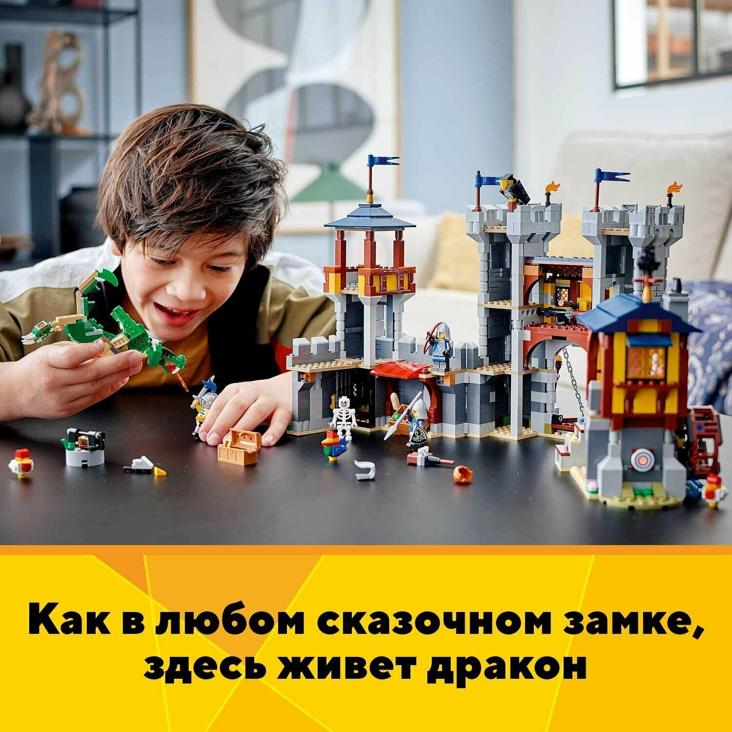 Лучшие цены. Отправляйтесь в путешествие во времени вместе с конструктором LEGO Creator 31120 «Средневековый замок». Будьте готовы к удивительным приключениям, которые поджидают вас в средневековом замке. Чтобы не пропустить огнедышащего дракона, забирайтесь на башню. Не забудьте закрыть ворота замка, а то дракон проскользнет внутрь. Приведите в движение кузницу, в которой создают самые крутые мечи, повернув водяное колесо. Магазины в вашем городе.