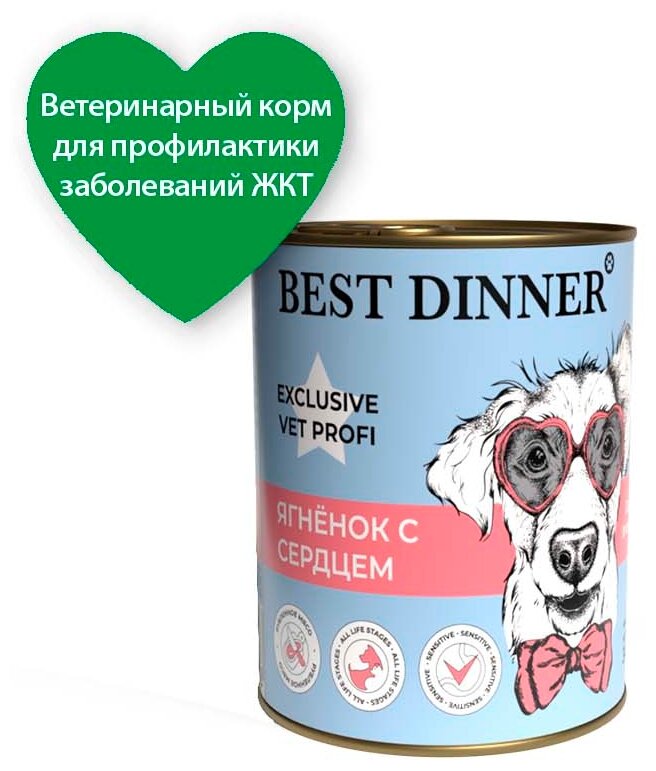 Влажный консервированный корм Бест Диннер Best Dinner для собак Exclusive Gastro Intestinal, ягненок, сердце, 340 гр. По 12 шт.