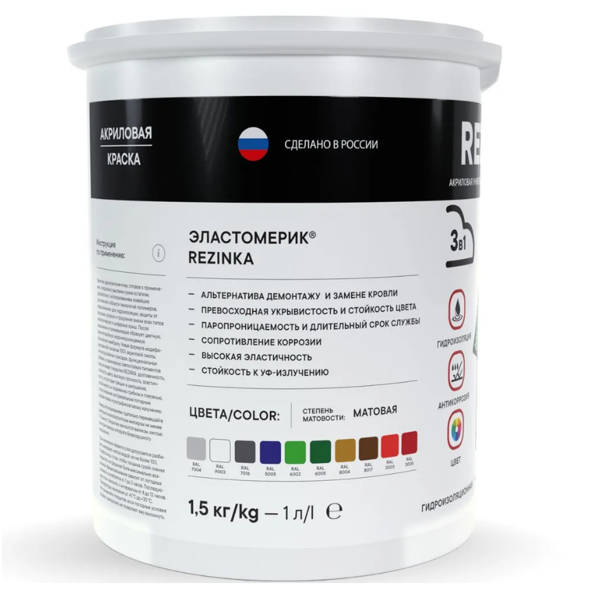 Краска резиновая REZINKA универсальная акриловая эластичная для фасадов, интерьера, мебели, кровли, цоколей, моющаяся, быстросохнущая, без запаха, матовая 1л, RAL 9003 сигнально-белый 995 ₽ Подробнее