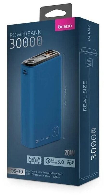 Внешний аккумулятор Olmio QS-30, 30000mAh, 22.5W, QuickCharge3.0/PowerDelivery, LCD, темно-синий