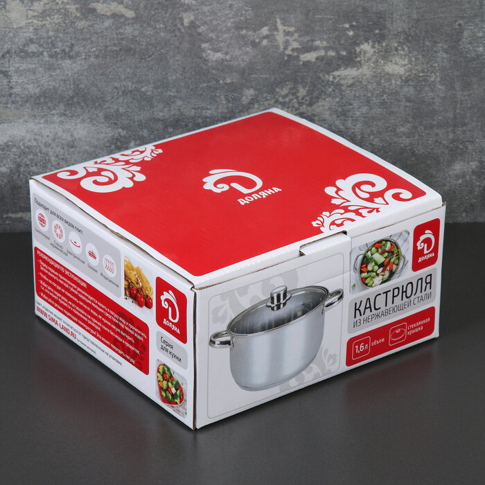 Кастрюля из нержавеющей стали Доляна «Гретте», 1,6 л, d=16 см, стеклянная крышка, капсульное дно, индукция