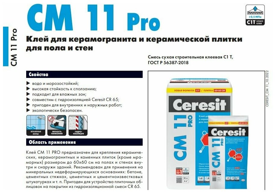 CERESIT CM 11 PRO клей для керамической плитки для пола и стен внутри и снаружи помещения (5кг)