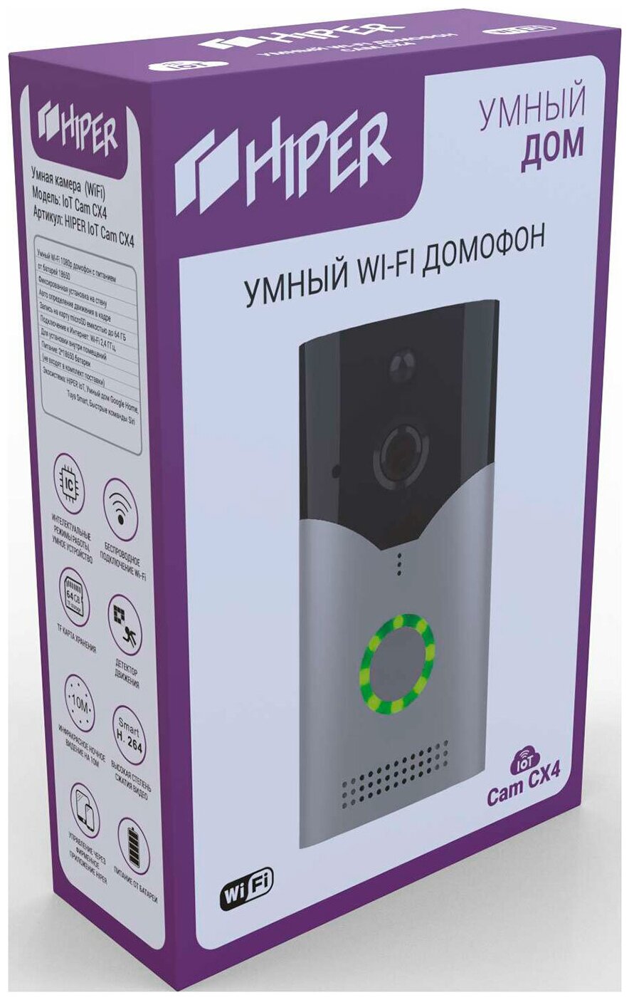 Лучшие цены. Умный домофон HIPER IoT Cam CX4 с питанием от двух литиевых аккумуляторов 18650 (не входят в комплект поставки) откроет для вас возможность принимать голосовые и видеозвонки с этого устройства через интернет Wi-Fi 2,4 ГГц, IEEE802.11b/g/n и RJ45 100Мбит, даже если вы находитесь вне дома. Посредством встроенных динамика и микрофона осуществляется традиционная двусторонняя связь. Автоопределение движения в кадре поможет своевременно узнать кто подошёл к вашей двери или прошёл мимо. Магазины в вашем городе.