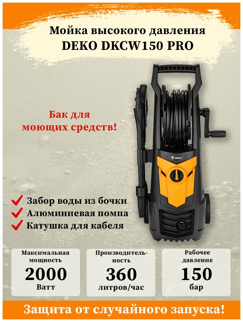Мойка высокого давления DEKO DKCW150 PRO (2000 Вт, 150 бар, шланг 8 м)