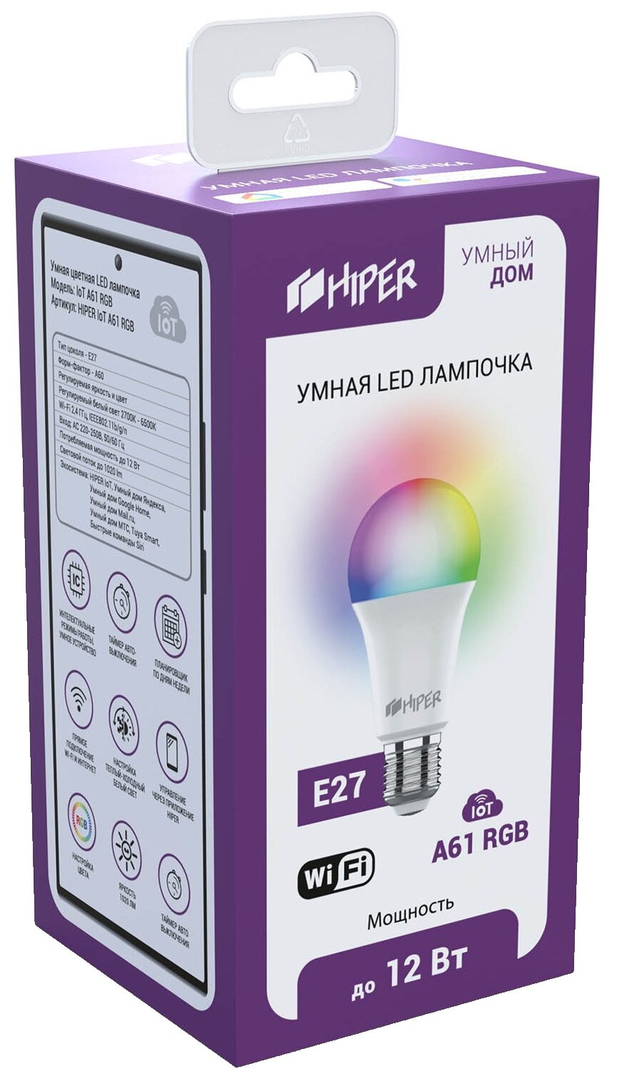 Лампочка Умная LED E27 лампочка Wi-Fi HIPER IoT A61 RGB цветная (IoT A61 RGB)