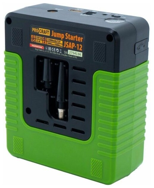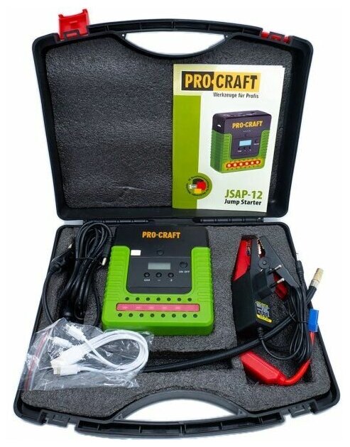 Лучшие цены. Пусковое зарядное устройство предназначено для запуска двигателя автомобиля при севшем или замерзщем аккумуляторе автомобиля. Пусковое устройство можно использовать как PowerBank (внешний аккумулятор) и заряжать телефон, планшет и другие устройства. Ёмкость встроенного аккумулятора 2500 мАч. В комплекте так же есть разъем типа " прикуриватель" для питания внешний устройств. Пуско-зарядное устройство Proсraft JSAP12 подходит для бензиновых и дизельных двигателей. Магазины в вашем городе.