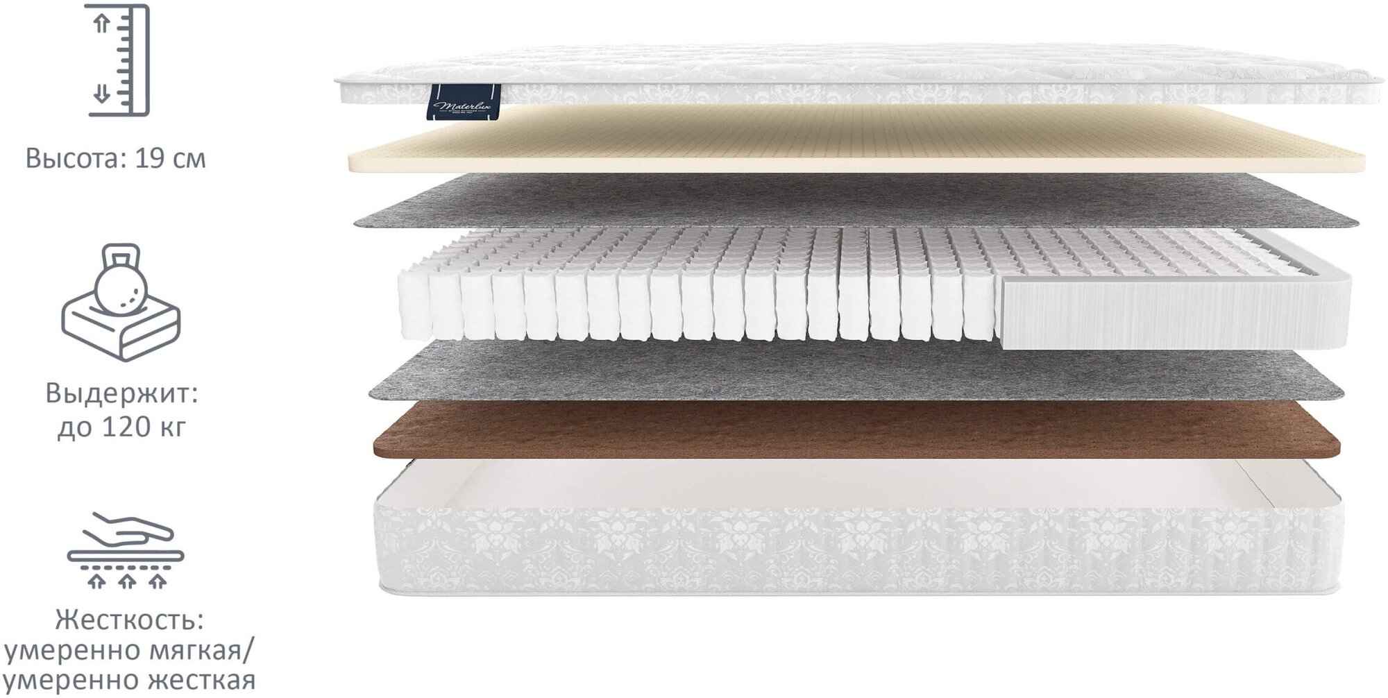 Лучшие цены. Итальянский ортопедический Матрас Materlux Ankara из линейки Elite выдерживает нагрузку в 120 кг на спальное место. По высоте в 19 см эта модель подходит для большинства стандартных кроватей. У изделия две стороны с разной жесткостью, его можно периодически переворачивать, чтобы менялись ощущения во время сна. С умеренно-мягкой стороны лежит слой бельгийского натурального Latexа в 3 см. Магазины в вашем городе.