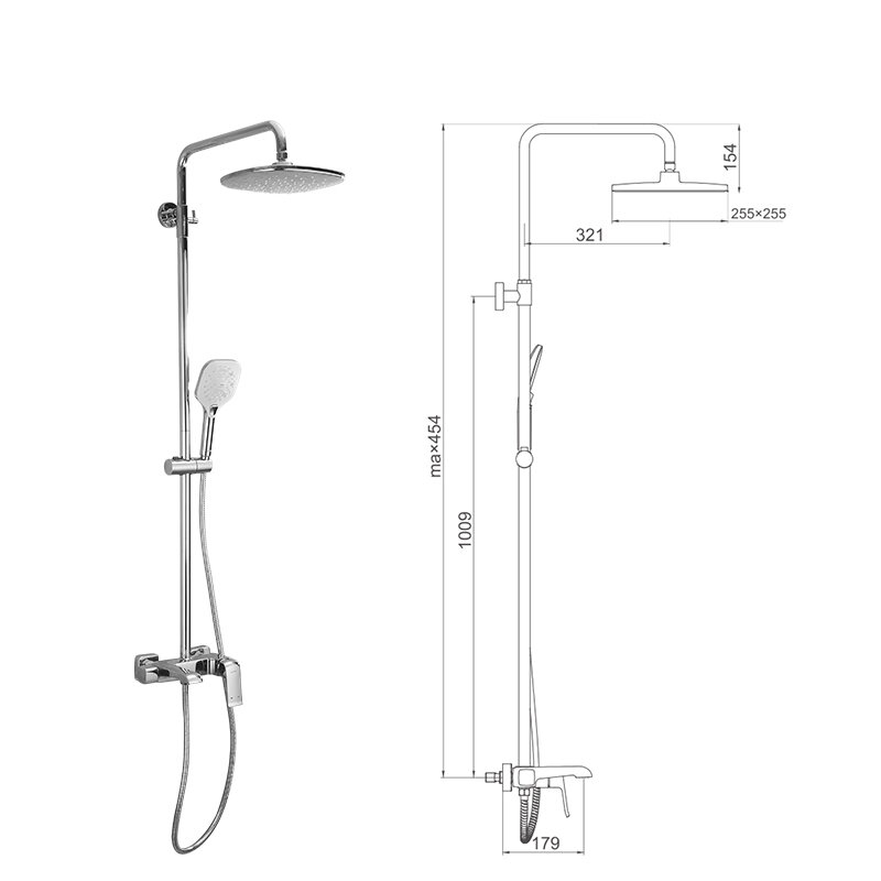 | Комплектация | ручной душ (душевая лейка) / верхний душ (тропический) / смеситель / стойка / штанга / душевой шланг / крепление ручного душа |