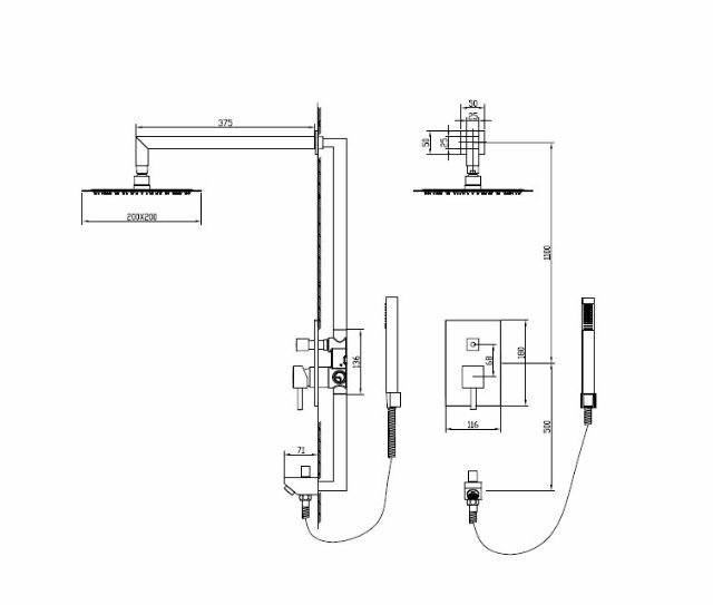 | Комплектация | ручной душ (душевая лейка) / верхний душ (тропический) / смеситель / излив / душевой шланг / крепление ручного душа / настенный кронштейн |