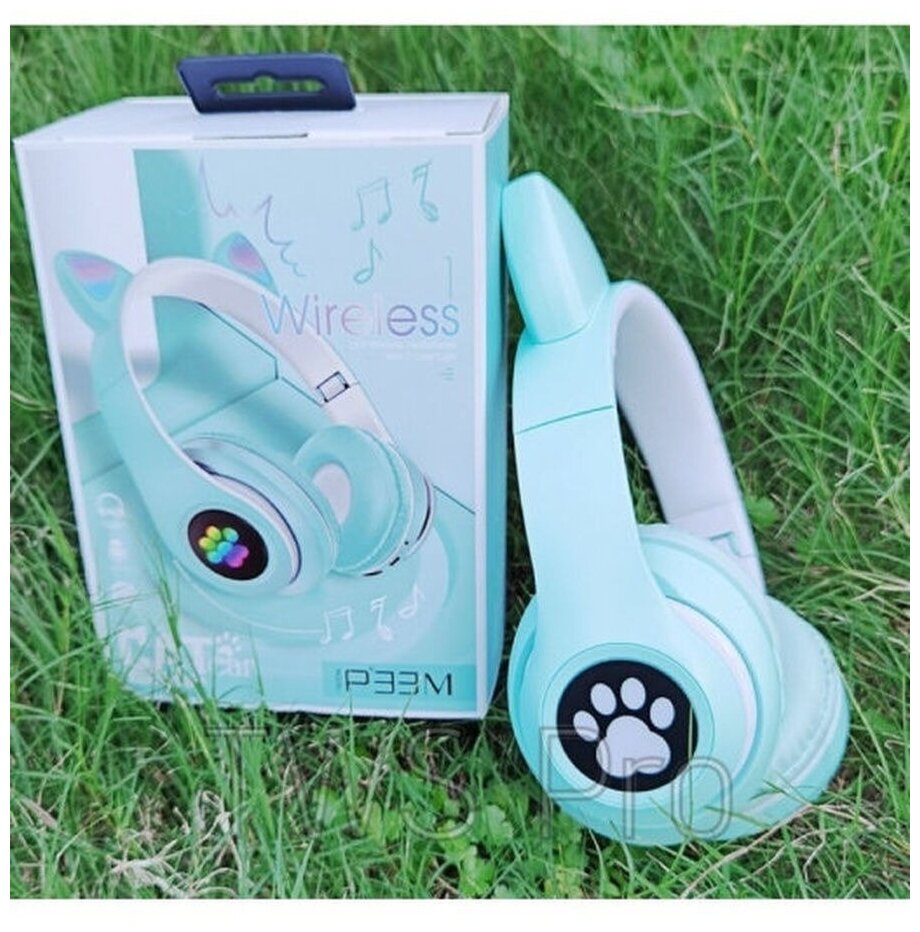 Наушники беспроводные детские с ушками / Светящиеся детские беспроводные наушники с ушками / Беспроводные наушники детские / Наушники с ушами мятные